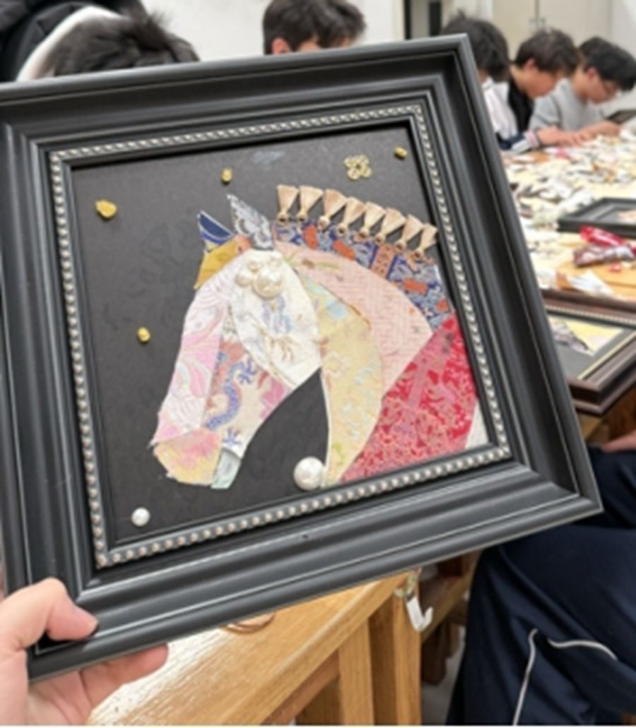 如果說文藝表演展現(xiàn)了學(xué)子們現(xiàn)代的、國際化的風(fēng)采,隨后沉浸式進(jìn)行的“宋錦福馬”文化學(xué)習(xí)體驗(yàn)活動(dòng),則帶領(lǐng)他們步入了一個(gè)寧靜而瑰麗的傳統(tǒng)藝術(shù)世界。“宋錦”被譽(yù)為中國“錦繡之冠”,其紋樣精致、色澤典雅;“福馬”則是承載美好祝愿的獨(dú)特傳統(tǒng)飾物。在指導(dǎo)老師的講解下,學(xué)生們了解了這項(xiàng)古老技藝的歷史淵源與文化內(nèi)涵。隨后,大家紛紛動(dòng)手嘗試,在交織的錦緞紋理間,在勾勒福馬圖案的過程中,親手觸摸穿越千年的絲滑質(zhì)感,感受宋錦所蘊(yùn)含的匠心與祈福寓意。這一刻,課堂知識(shí)與實(shí)踐體驗(yàn)完美結(jié)合,抽象的文化變得可觸。